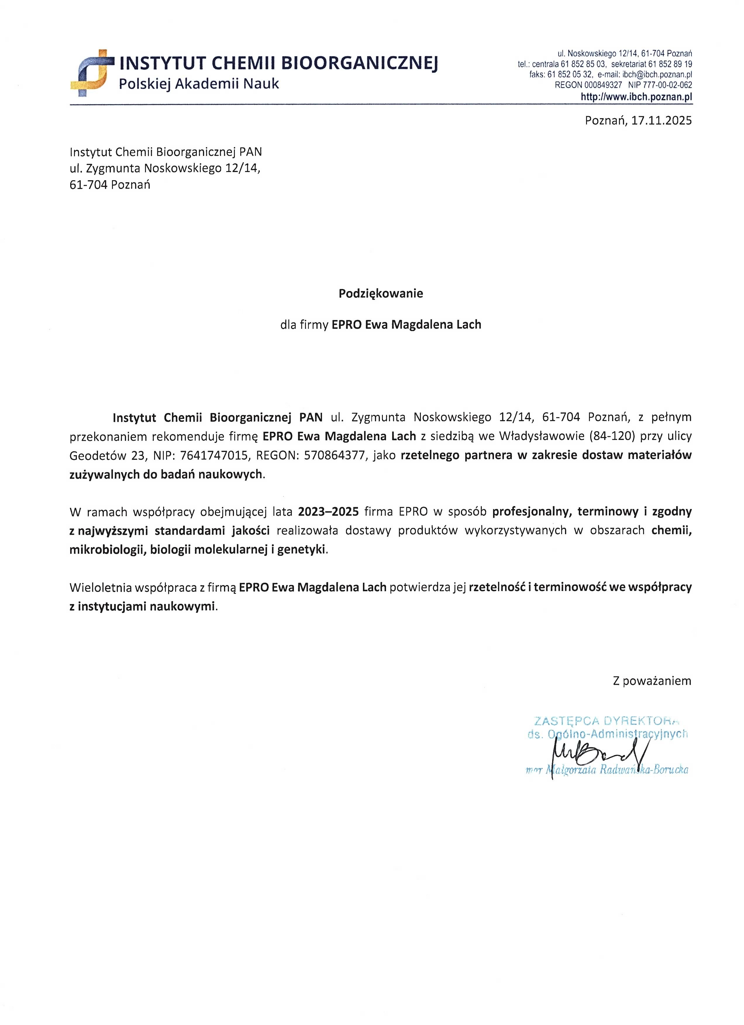 Jakość naszych produktów i wysoki standard współpracy zapewnia naszym Klientom spokój ducha i eliminuje potrzebę szukania alternatyw, umożliwiając im skupienie się na badaniach i odkryciach. Szacunek, uczciwość i pasja są podstawą firmy EPRO. Tworzymy komfortową przestrzeń do efektywnej pracy dla naszego zespołu, aby wszyscy mogli realizować swoje marzenia i uwalniać pełny potencjał w pracy i poza nią. Budowanie partnerstwa z dostawcami w oparciu o dialog, dopasowanie priorytetów i uwspólnianie wartościowych celów.